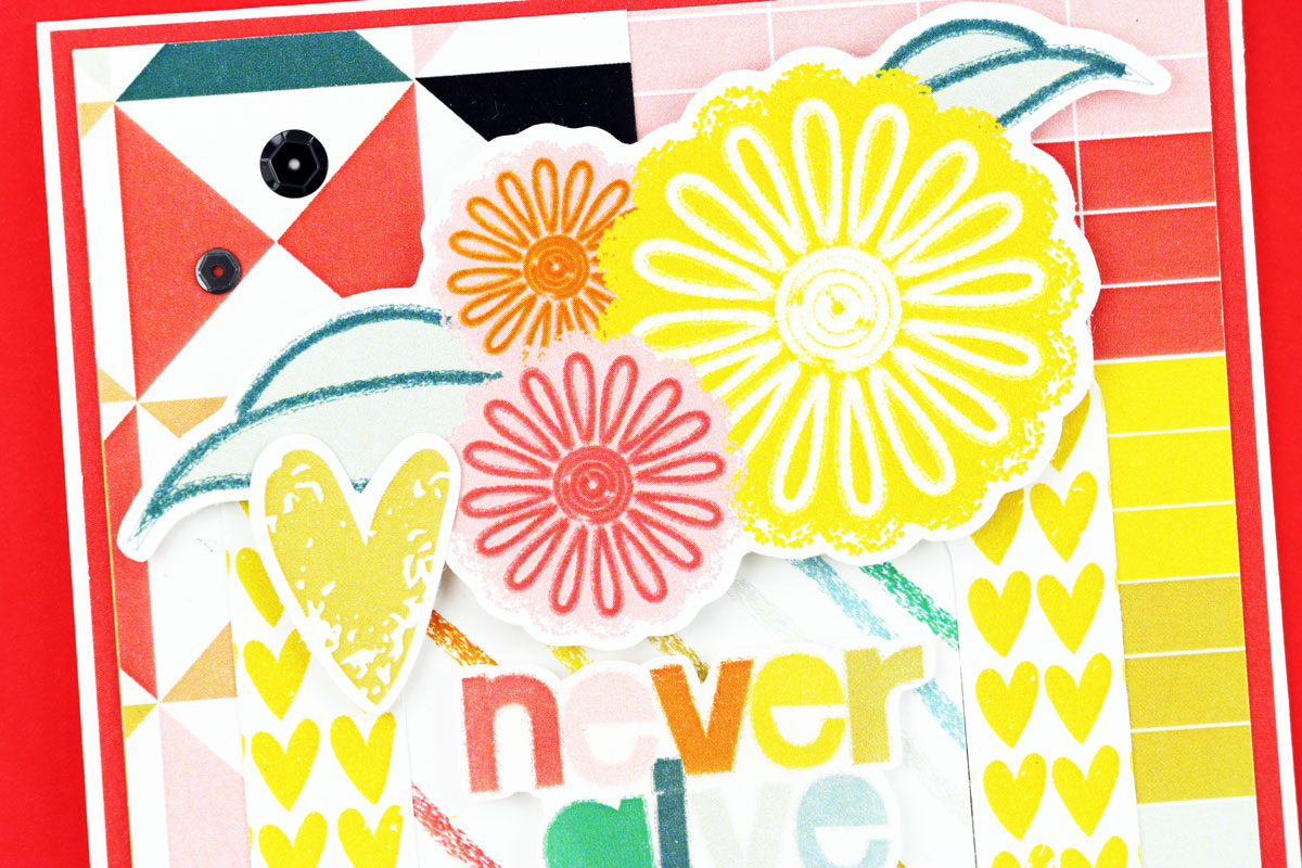 I used a frame to create a focal point for my message to never give up. I had fun embellishing the frame with flowers and a little tag that I topped with a labelmaker type sentiment sticker.